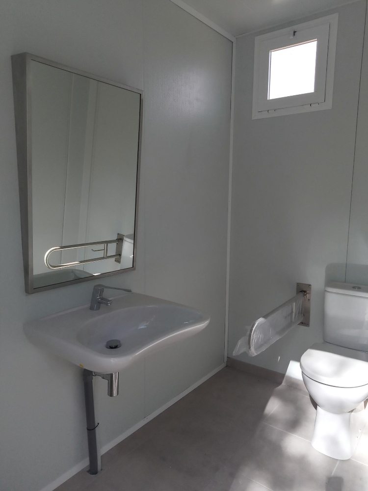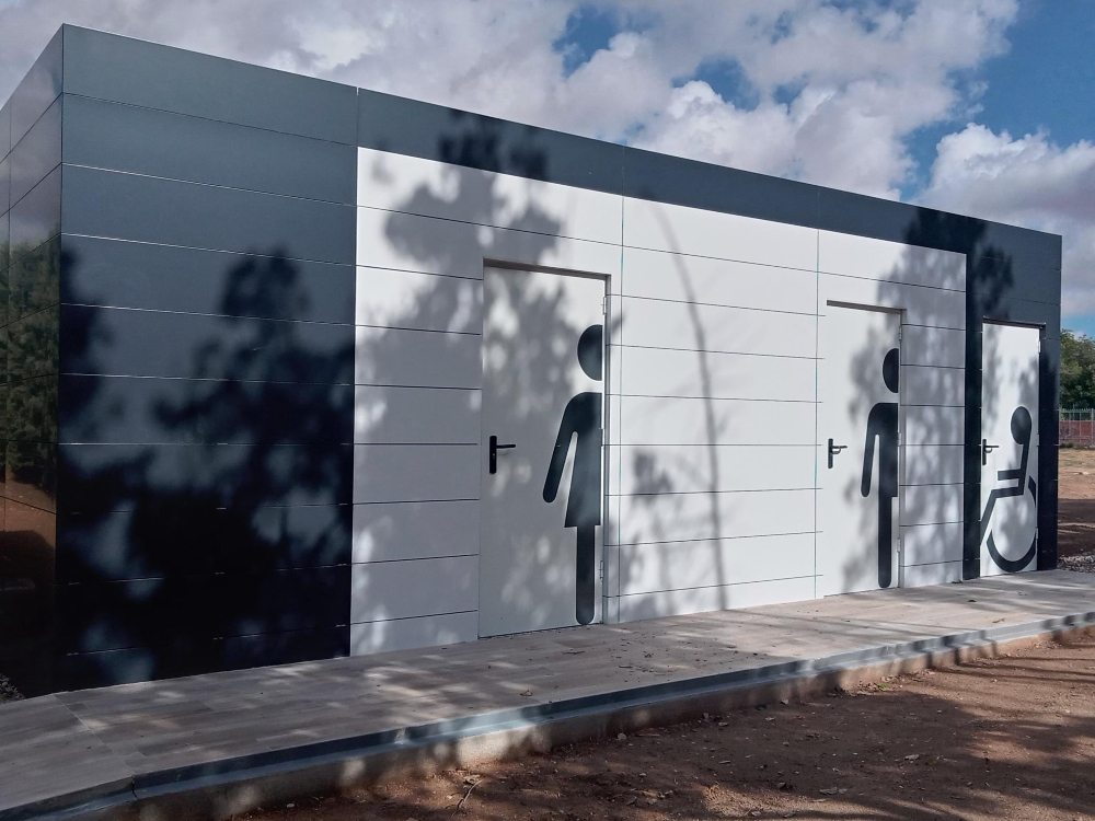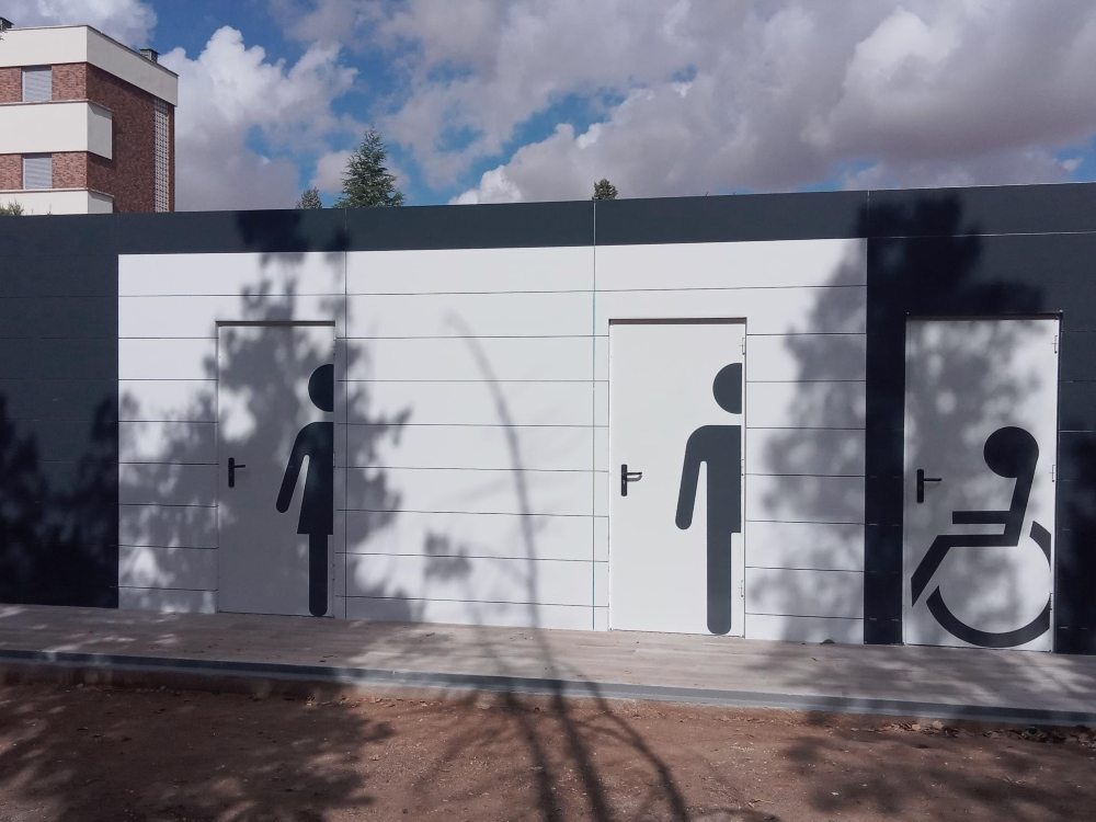 En el Centro Universitario Cardenal Cisneros, adscrito a la Universidad de Alcalá de Henares (Madrid) necesitaban unos aseos para uso de mujeres, hombres y adaptado, a ser posible en un único módulo con acabados exteriores de gran calidad. Desarrollamos una solución compacta, de fácil montaje y con posibilidad de un cambio de posición a futuro.